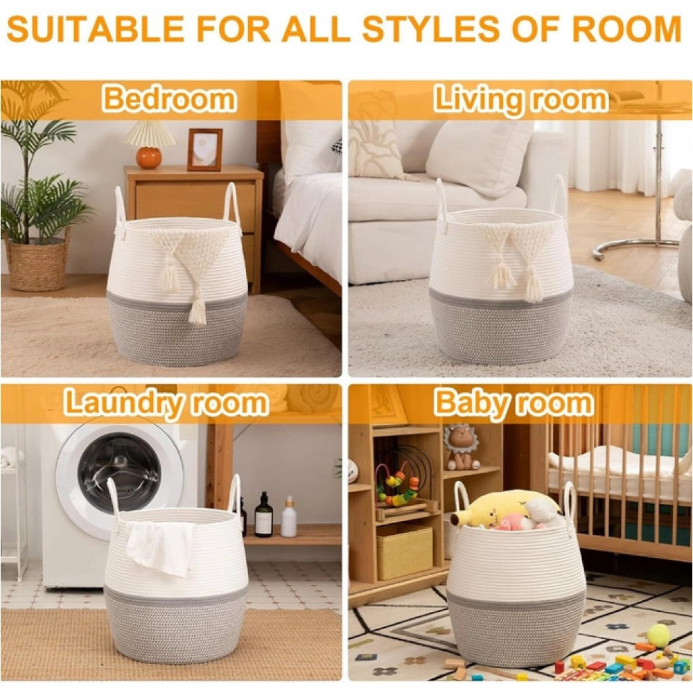 Cotton Matka With Handle 14x12 Inch Storage Basket For Clothes (Gray White)