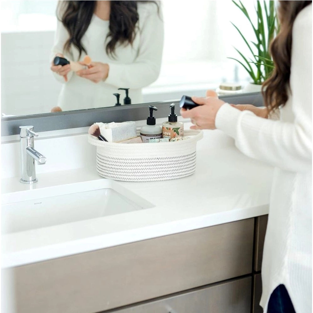 Cotton Zigzag Oval Basket Pack of 3 Storage Basket For Clothes (White)